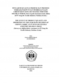 PENGARUH KUALITAS PRODUK DAN PROMOSI TERHADAP KEPUTUSAN PEMBELIAN KAIN CHIFON DI PT SENG DO TEXTILE INDUSTRY SOLOKAN JERUK (Survei pada konsumen kain chifon di PT Seng Do Textile Industry Solokan Jeruk ) THE EFFECT OF PRODUCT QUALITY AND PROMOTION ON THE PURCHASE DECISION OF CHIFON FABRIC AT PT SENG DO TEXTILE INDUSTRY SOLOKAN JERUK (Survey on chiffon fabric consumers at PT Seng Do Textile Industry Solokan Jeruk)