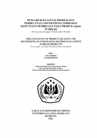 PENGARUH KUALITAS PRODUK DAN PERIKLANAN (ADVERTISING) TERHADAP KEPUTUSAN PEMBELIAN PADA PRODUK Liptint WARDAH (Survey pada pelanggan Produk Liptint Wardah) THE INFLUENCE OF PRODUCT QUALITY AND ADVERTISING ON PURCHASING DECISIONS ON LIPTINT WARDAH PRODUCTS (Case studies on Liptint Wardah product customers) PENGARUH KUALITAS PRODUK DAN PERIKLANAN (ADVERTISING) TERHADAP KEPUTUSAN PEMBELIAN PADA PRODUK Liptint WARDAH (Survey pada pelanggan Produk Liptint Wardah) THE INFLUENCE OF PRODUCT QUALITY AND ADVERTISING ON PURCHASING DECISIONS ON LIPTINT WARDAH PRODUCTS (Case studies on Liptint Wardah product customers)