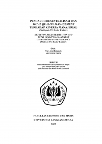 sebagai faktor yang dapat memperngaruhi tinggi atau rendahnya kinerjmanajerial. Penelitian ini bertujuan untuk mengetahui pengaruh desentralisasi datotal quality management terhadap kinerja manajerial pada PT. Hadar Kuliner.Hasil penelitian ini diharapkan bisa menjadi solusi atas masalah yang terjaditerhadap kinerja manajerial pada PT. Hadar Kuliner.